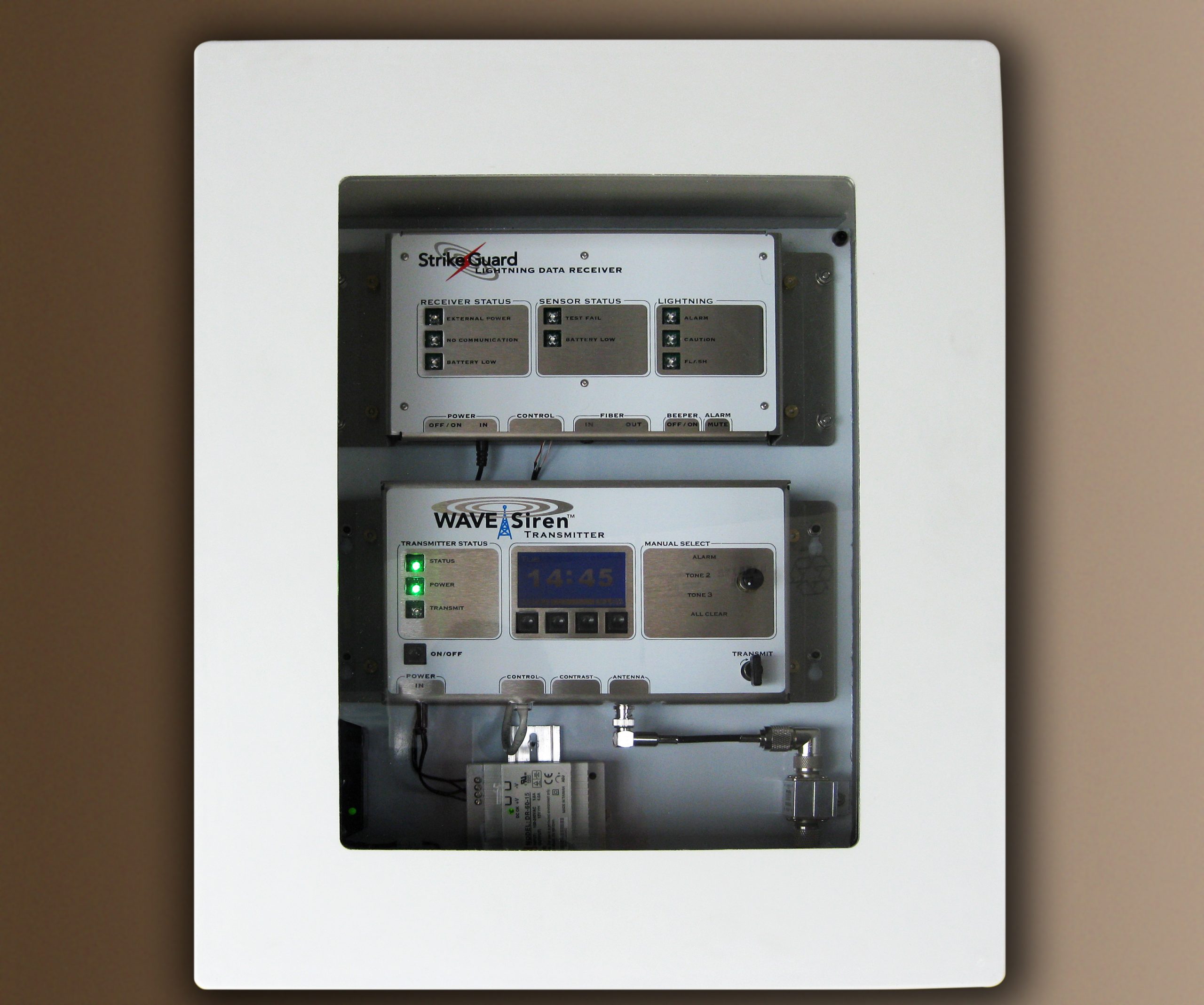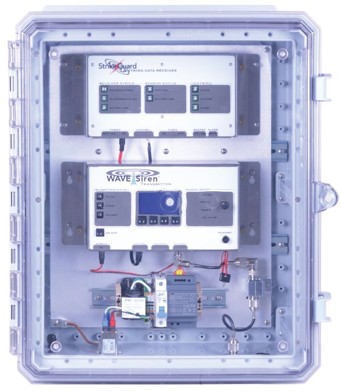 Strike Guard Lightning Data Receiver (sold separately) & WAVE Transmitter are assembled and mounted in a 20 x 16 x 10 inch enclosure with clear door and complete lightning protection for incoming conductors and power supply.